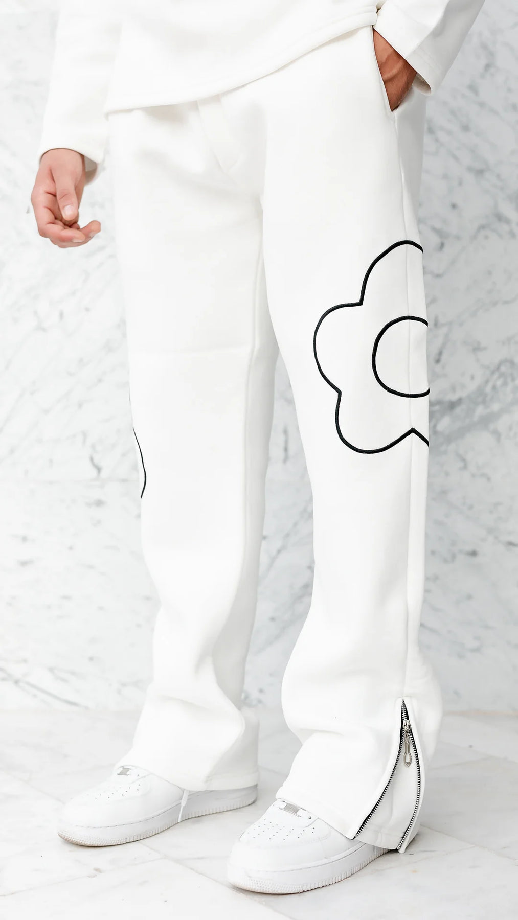 • Détails : Broderies florales contrastées + zips métalliques au bas du pantalon.