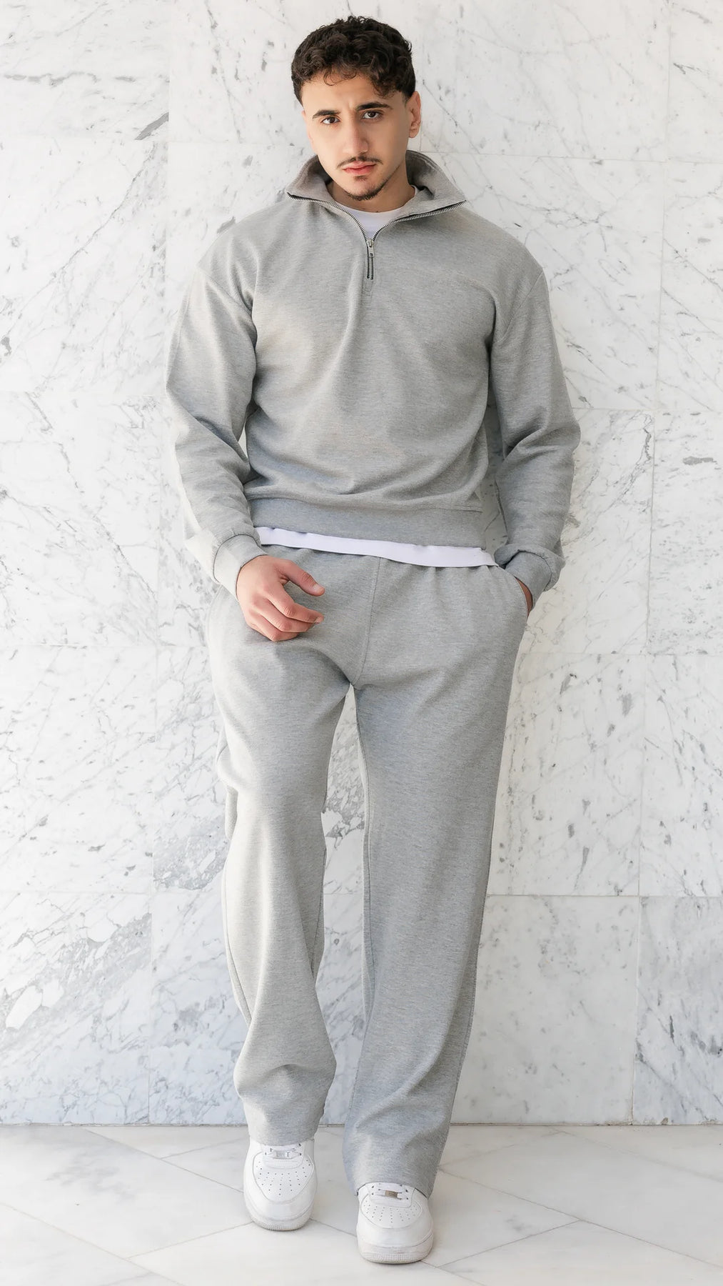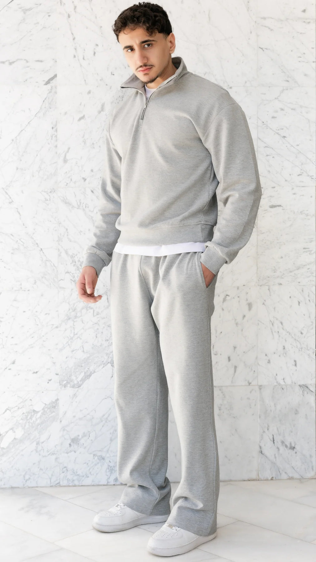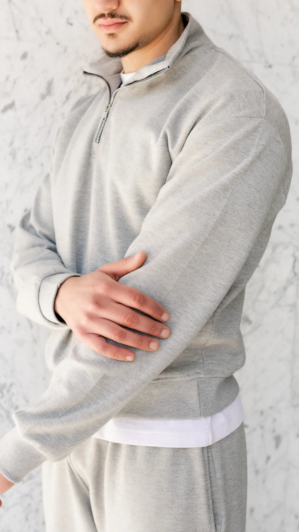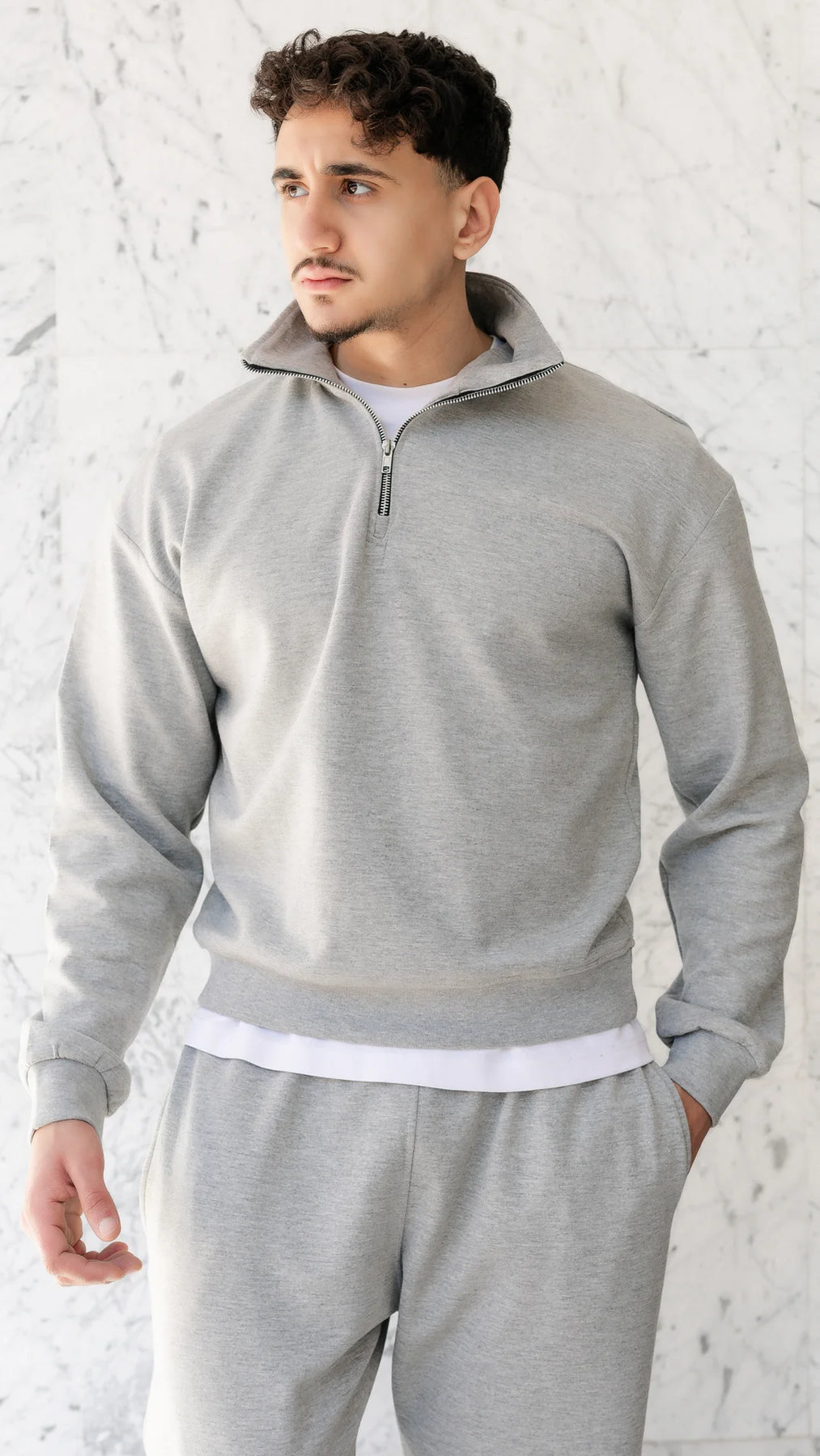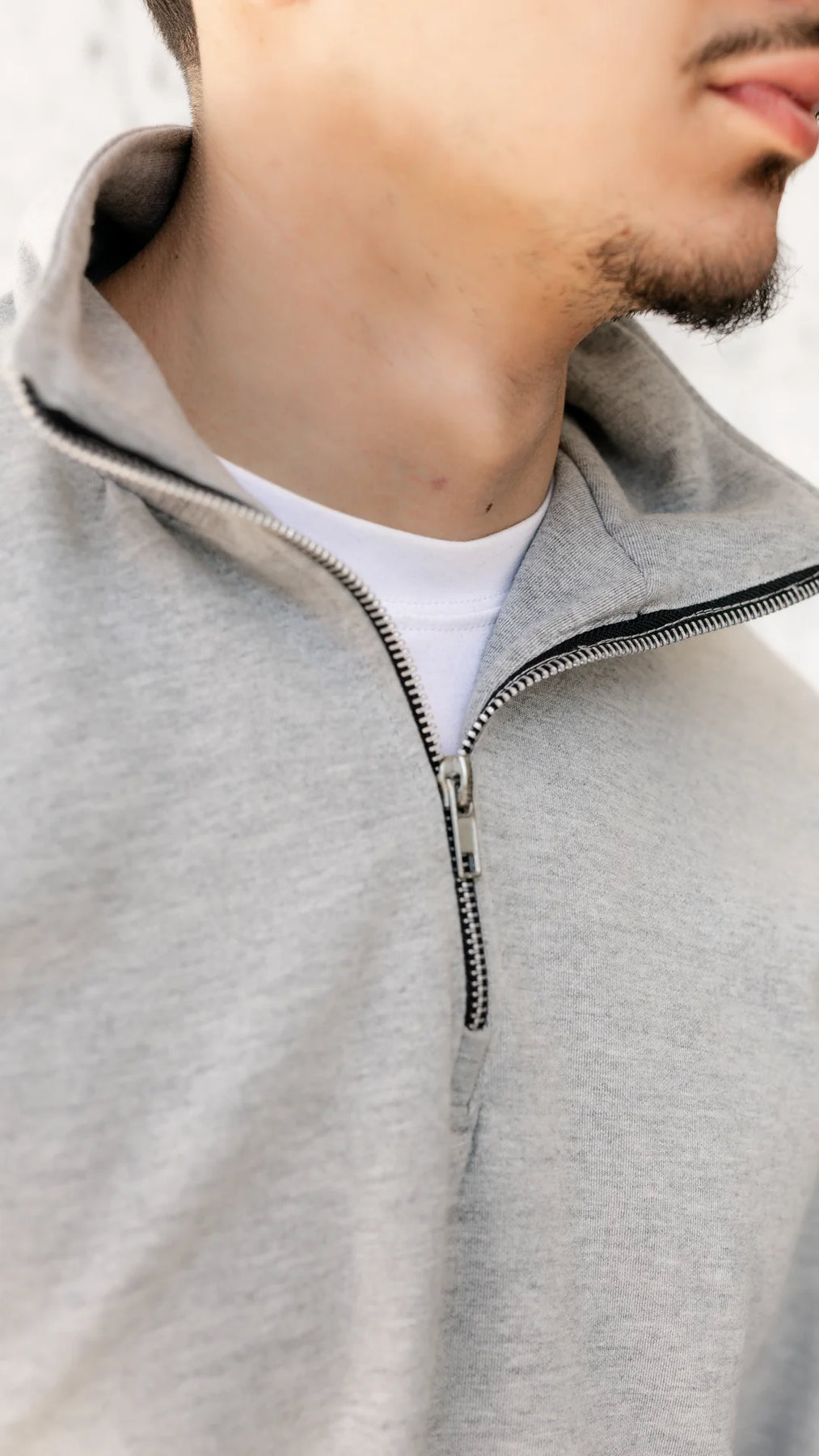 • Demi-zip travaillé — le détail qui fait la différence. Assez pour élever le style, jamais trop.